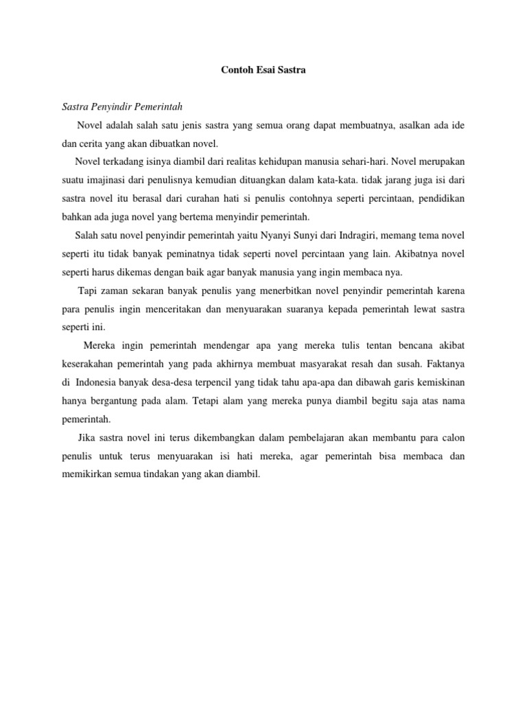 . Puluhan tayangan yang berhasil masuk nominasi. Berikan contoh kritik sastra dan esai lengkap pengertian esai adalah karangan prosa yang membahas suatu masalah secara sepintas lalu dari sudut pandang pribadi. Contoh Kritik Esai Novel.